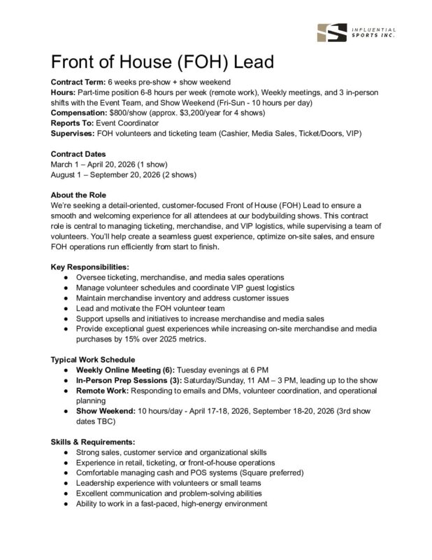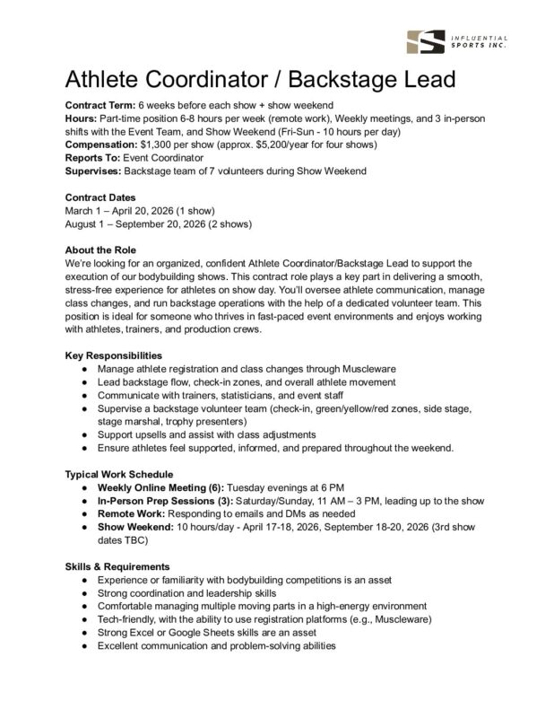 From backstage support to front-of-house roles, every position plays an important part in creating an amazing experience for athletes and spectators. No experience needed—just a positive attitude and a willingness to help.