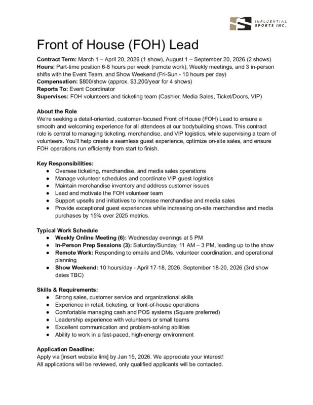 1. Athlete Coordinator / Backstage Lead 2. Front of House (FOH) Lead